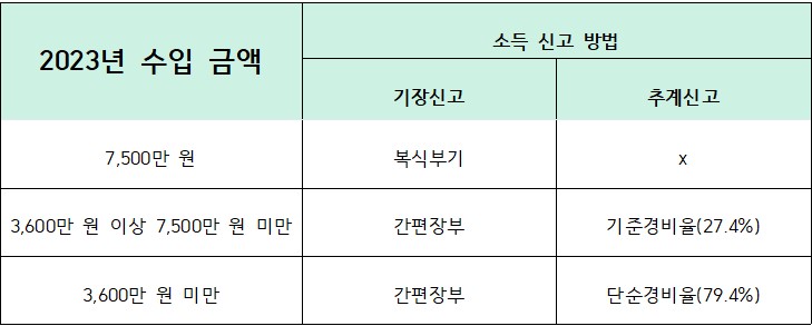 또한 전연도 수입 금액에 따라 단순경비율, 기준경비율 적용이 달라집니다.
