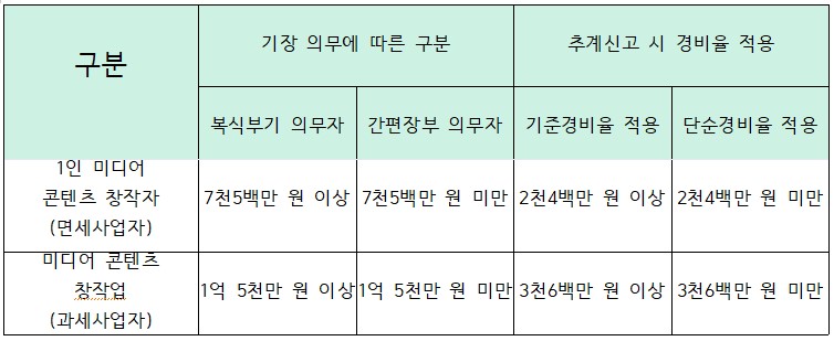 1인 미디어 콘텐츠 창작자, 미디어 콘텐츠 창작자 둘 모두는 발생한 소득에 대한 5월 종합소득세 신고를 해야 합니다. 단, 1인 미디어 콘텐츠 창작자는 부가가치세가 면제되는 면세사업자이기도 합니다. 하지만 미디어 콘텐츠 창작자는 과세사업자로 일반과세자와 간이과세자를 선택해 사업자 등록해야 해야 하고 세금을 내야 합니다.